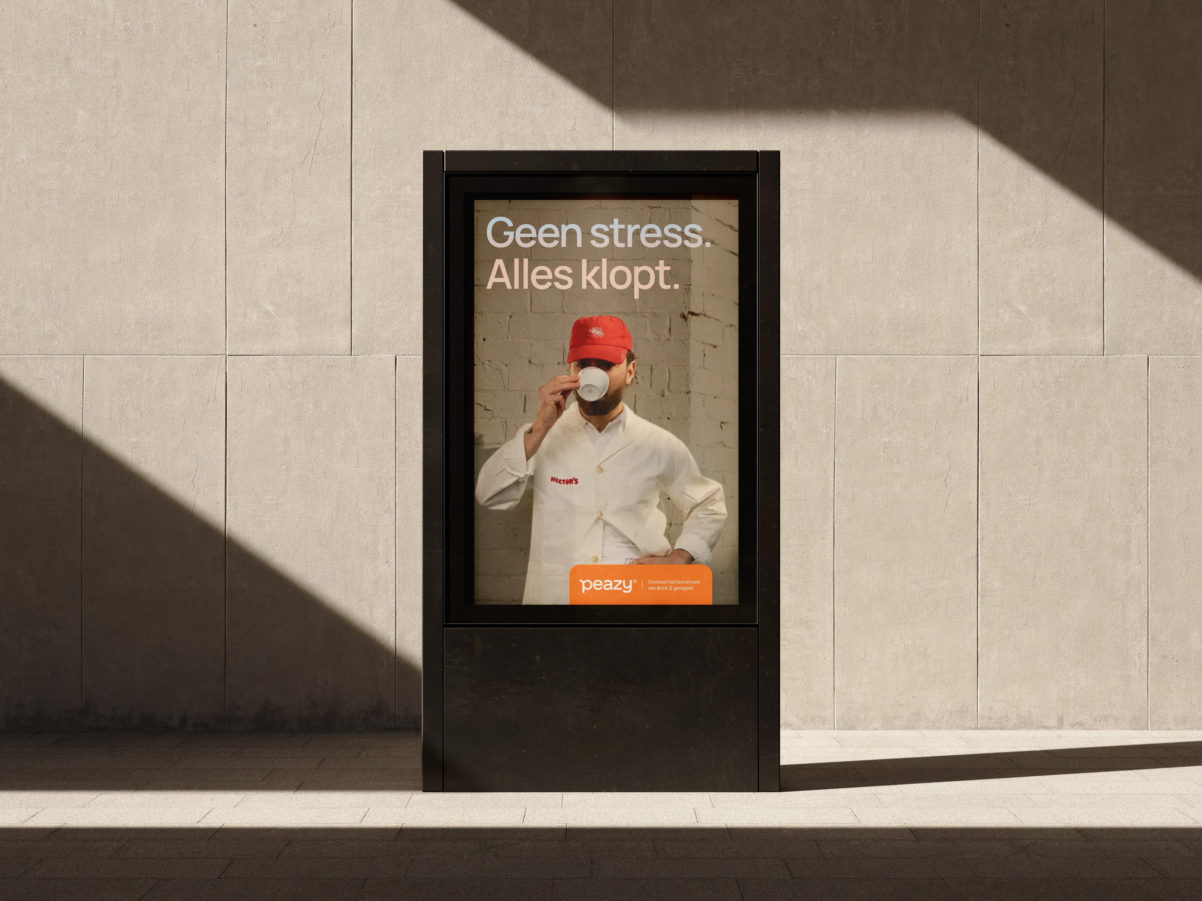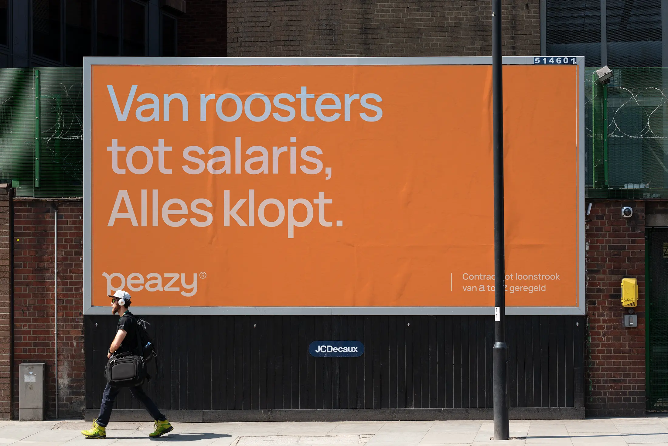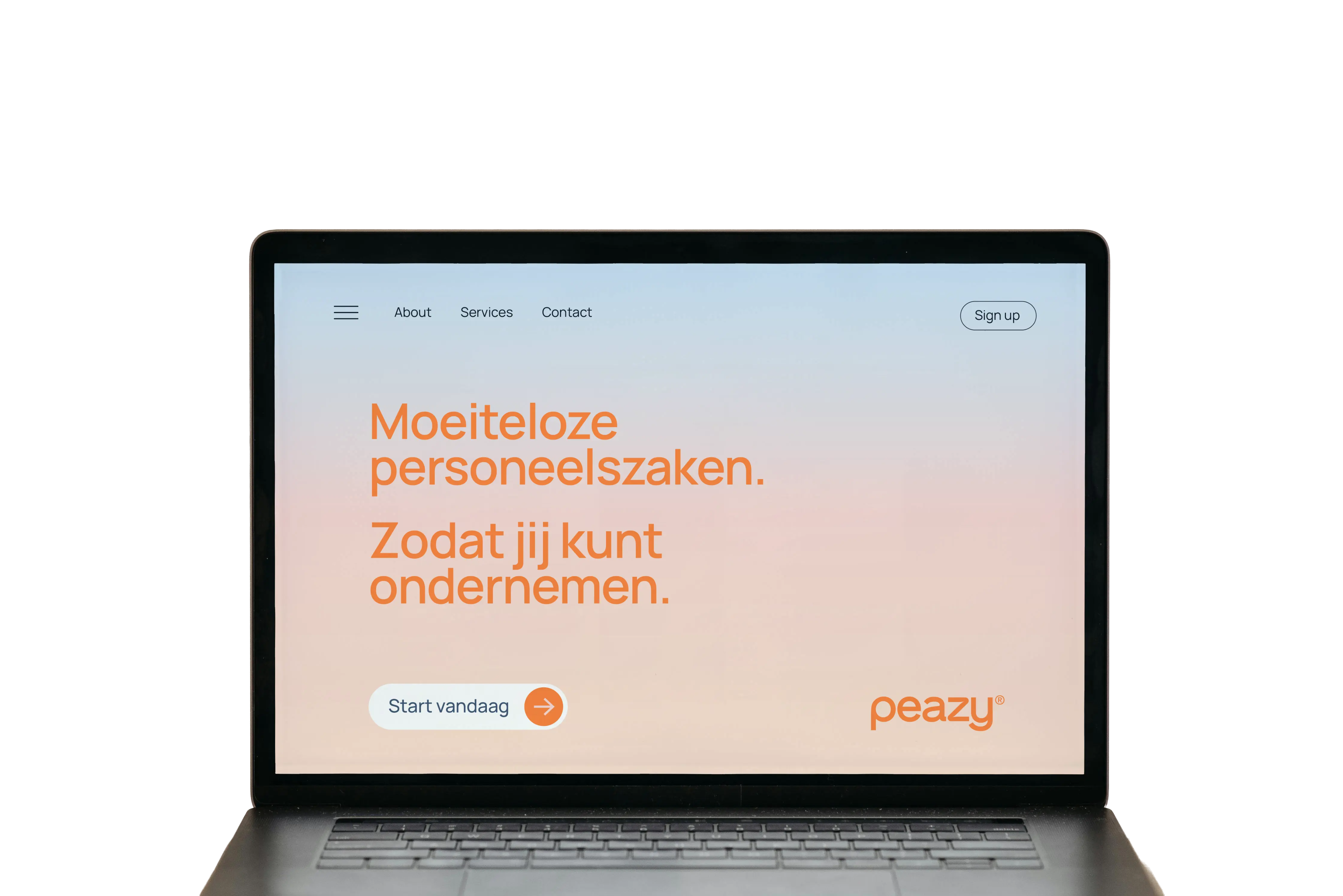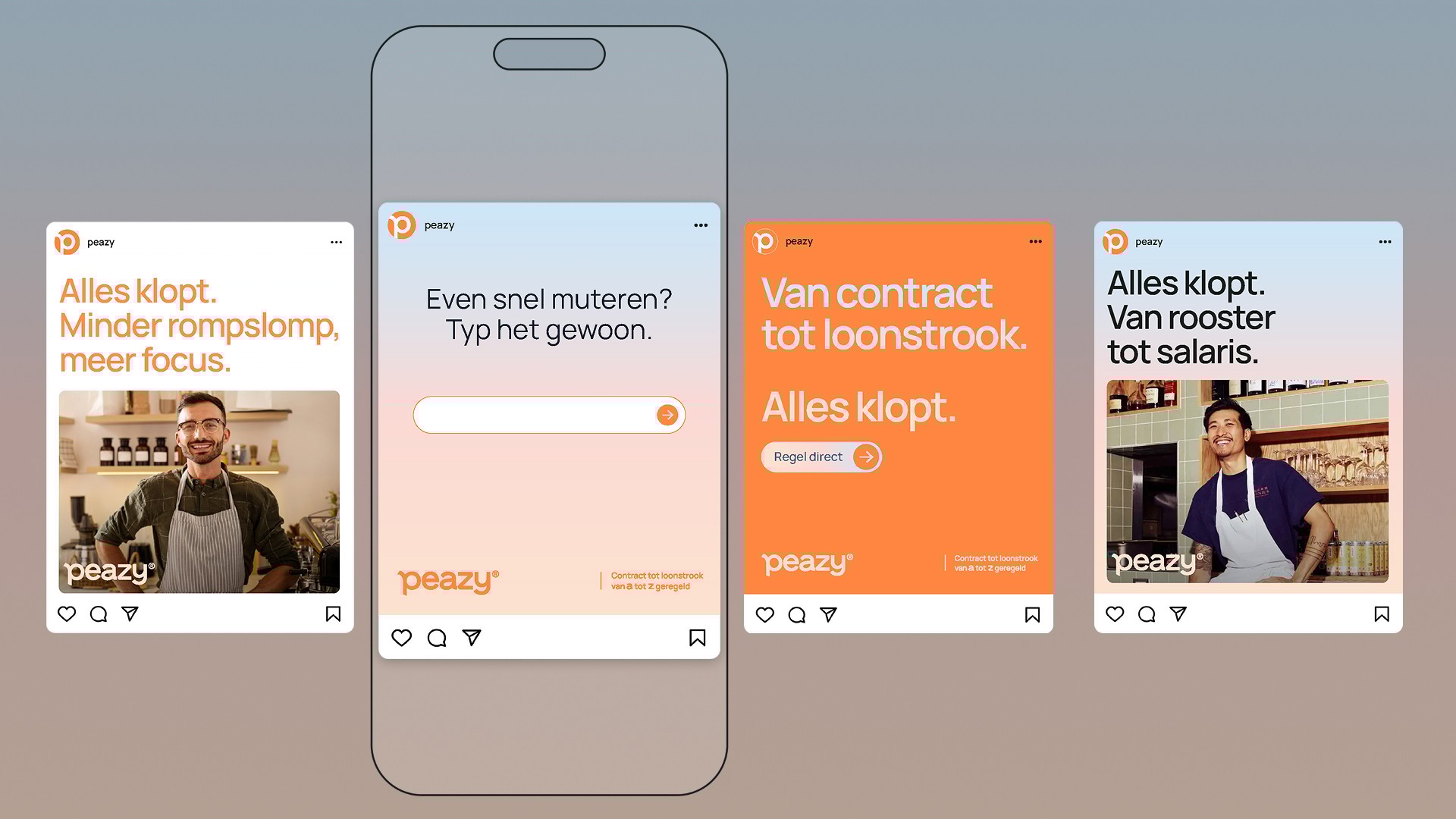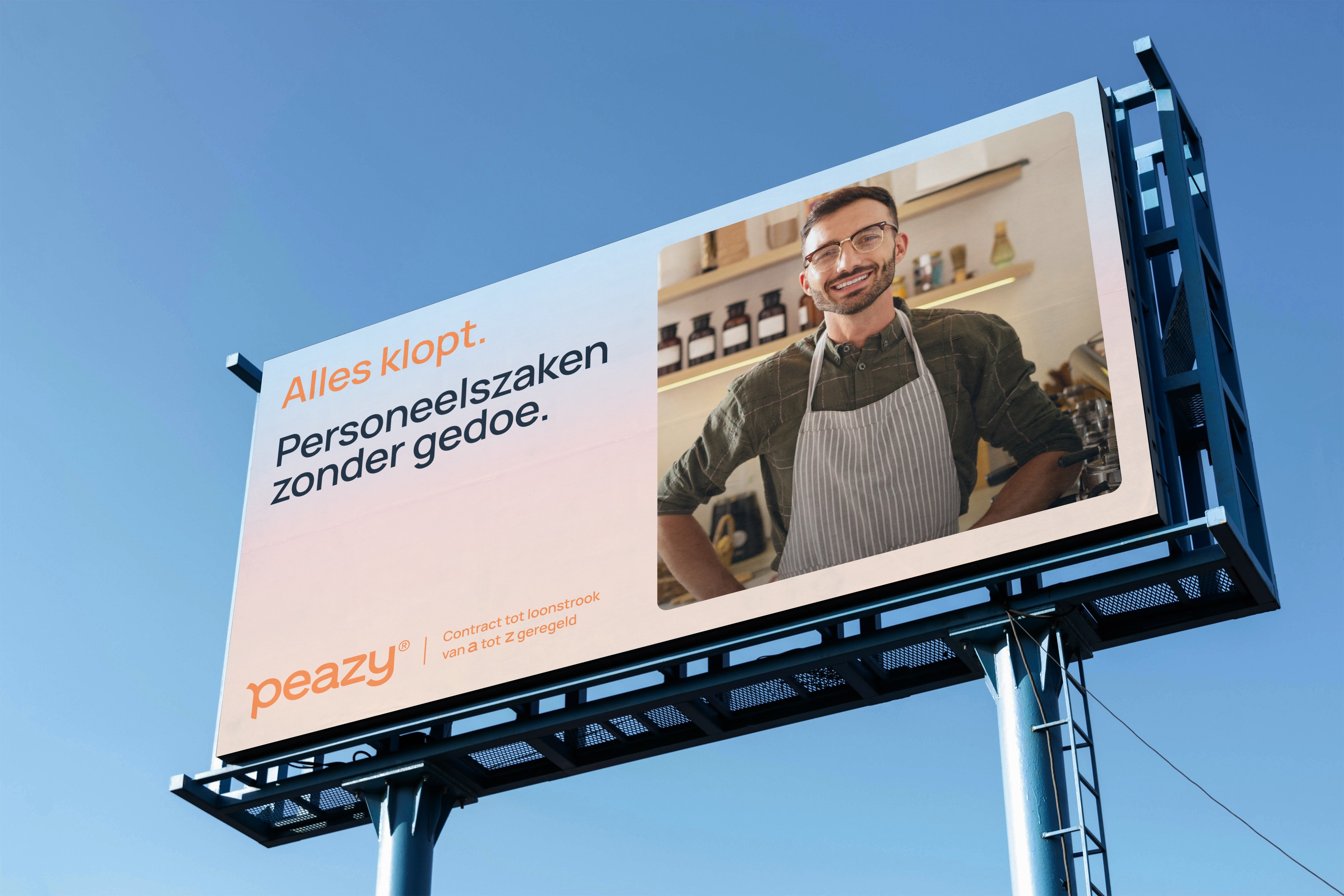 Onze slogan “Je personeelszaken van A tot Z geregeld” krijgt een dynamische vorm. Het woord “personeelszaken” roteert steeds met concrete onderdelen uit de loonstraat, zoals contracten, loonstroken, vakanties, ziektemeldingen en CAO-afspraken. Op die manier laten we in één oogopslag zien dat Peazy álle schakels van de loonstraat dekt – van instroom tot salaris – en maken we de boodschap herkenbaar en relevant voor iedere ondernemer.